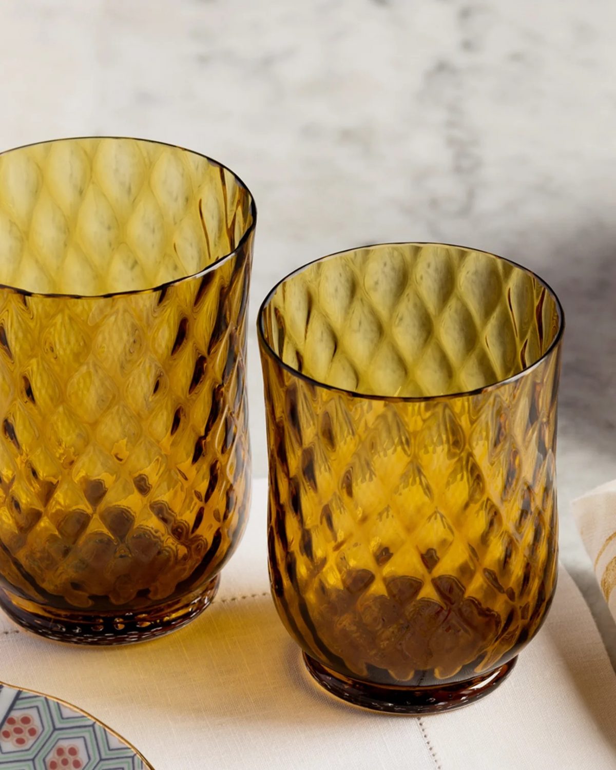 Cabana striking Balloton glasses are hand-blown on Murano, the island home of Venice’s centuries-old glass trade. A classically elegant shape, the amber glasses feature an undulating honeycomb pattern. Made from the finest quality Venetian glass, they are a cheerful addition to any tabletop, whether a relaxed family meal or a festive gathering of friends.